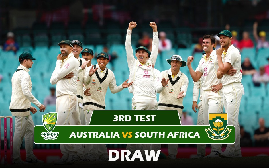 AUS vs SA HIGHLIGHTS – Australia vs SouthAfrica 3rd Test at SCG ends in Draw – South Africa 255/10 (1st innings) & 106/2 (2nd innings) vs Australia 475/4 (1st innings) – The 3rd Test between Australia and SouthAfrica ended in a draw after thrilling Day 5 on Sunday. The rain in Sydney prevented Australia from completing a perfect 5-0 summer, but the hosts’ achievement in even coming close to a victory on the final day was outstanding. Despite the draw, Australia won the South Africa series 2-0 after dominating the Proteas from ball one at the Gabba three weeks prior. Watch AUS vs SA LIVE Streaming on SonyLIV & Follow Australia vs SouthAfrica LIVE Updates with InsideSport.IN.