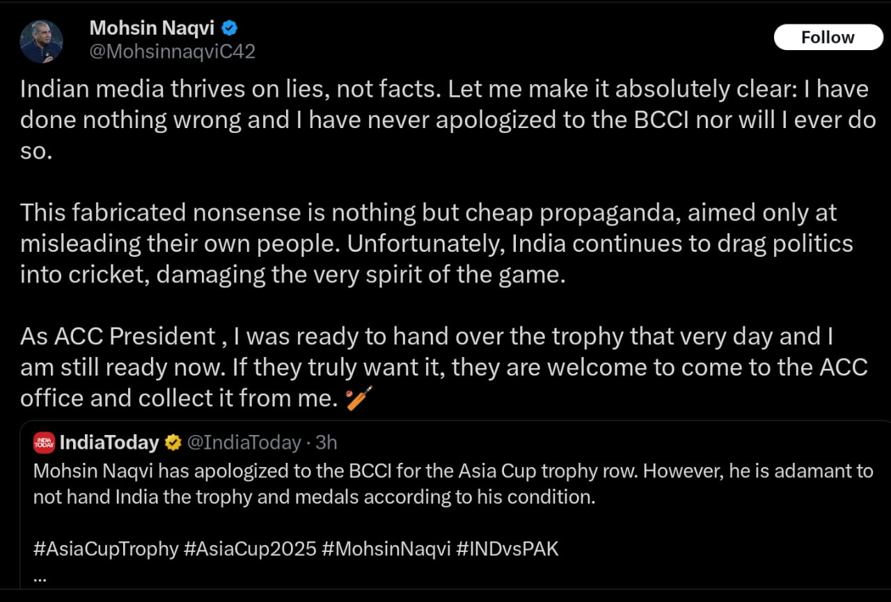 “Indian media thrives on lies, not facts. Let me make it absolutely clear: I have done nothing wrong, and I have never apologized to the BCCI nor will I ever do so. This fabricated nonsense is nothing but cheap propaganda, aimed only at misleading their own people. Unfortunately, India continues to drag politics into cricket, damaging the very spirit of the game. As ACC President, I was ready to hand over the trophy that very day, and I am still ready now. If they truly want it, they are welcome to come to the ACC office and collect it from me,” Naqvi wrote on X.