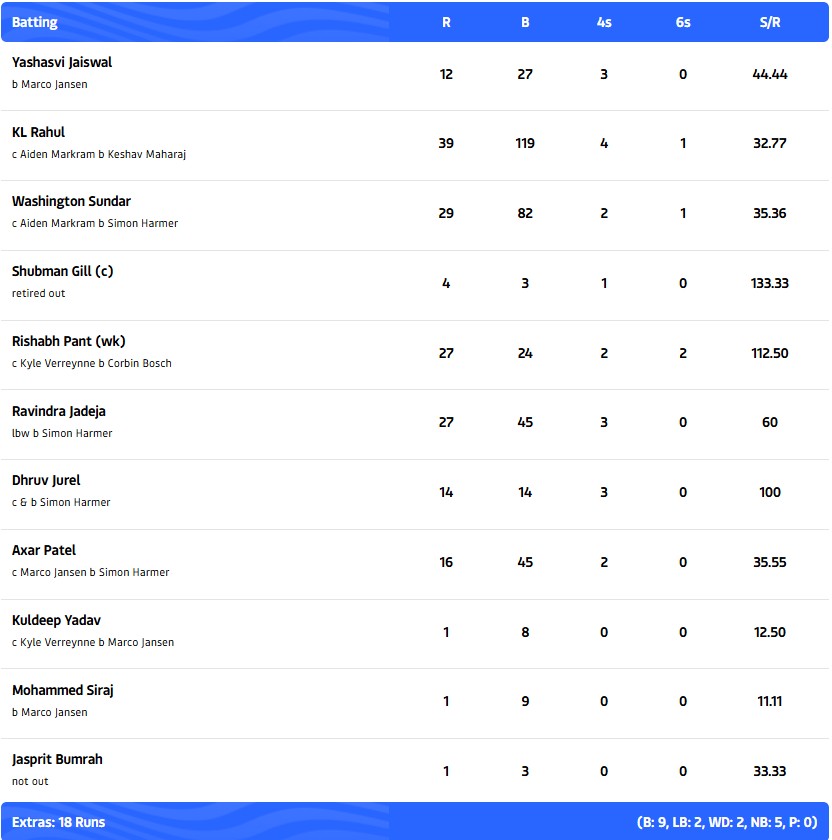 IND vs SA, 1st Test, Day 2: South Africa posted 93/7 at the end of Day 2 with Temba Bavuma on the crease on 29. Ravindra Jadeja bagged four wickets for 29 runs while Kuldeep Yadav (2/12) and Axar Patel (1/30) dealt the other blows. India were bowled out for 189 in the first innings for just a 30-run lead. Shubman Gill could not bat due to a neck spasm as he had to retire hurt on 4. KL Rahul top-scored with 39 as Simon Harmer bagged 4/30 and Marco Jansen returned with 3/35. India started well with Washington Sundar and KL Rahul dominating the first hour. But after the drinks break, the Proteas took control. Sundar was first to go as Simon Harmer struck. KL Rahul followed suit. Rishabh Pant played some exquisite shots but was undone by his aggression as he fell for 27. But the biggest blow was captain Shubman Gill. He retired hurt after a neck injury.