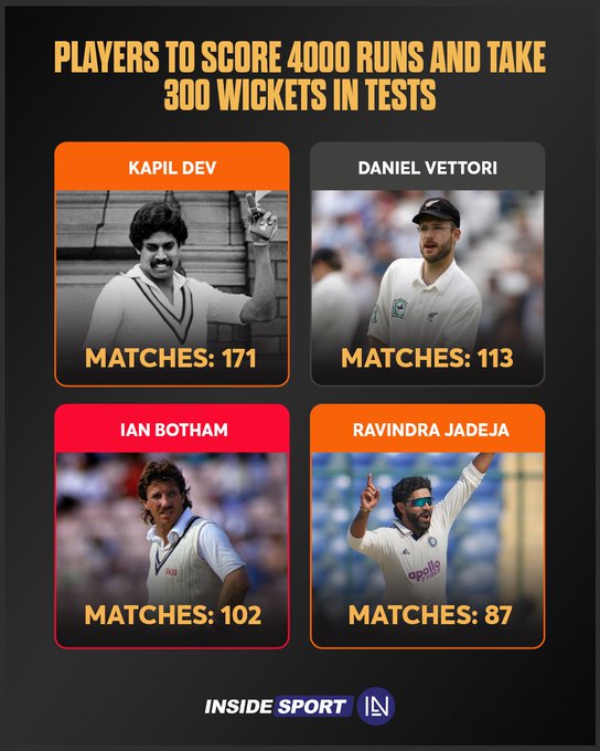 Ravindra Jadeja joins Kapil Dev, Ian Botham, and Daniel Vettori as only the fourth all-rounder to score 4000 runs and take 300 wickets in Test cricket.