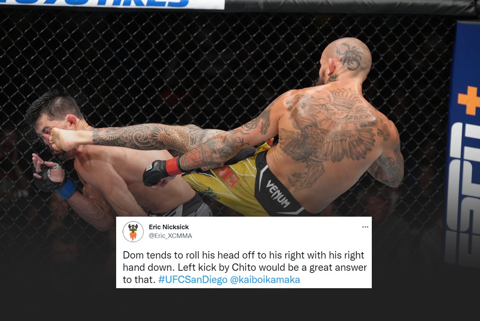 Eric in his tweet wrote “Dom tends to roll his head off to his right with his right hand down. Left kick by Chito would be a great answer to that.”